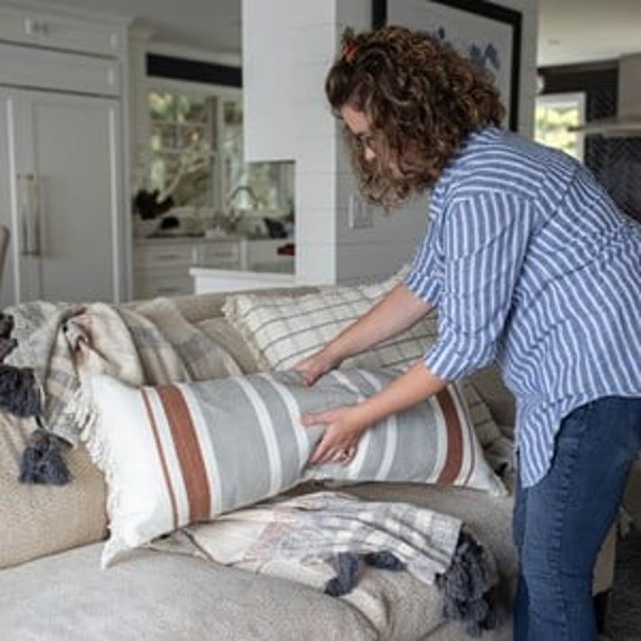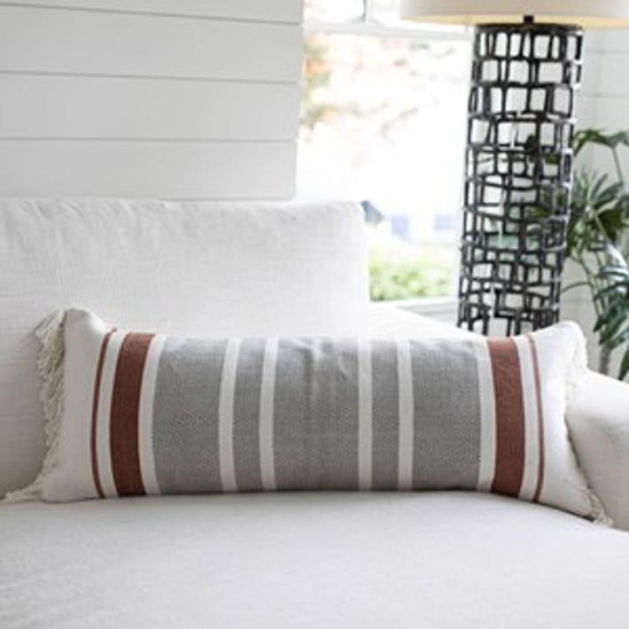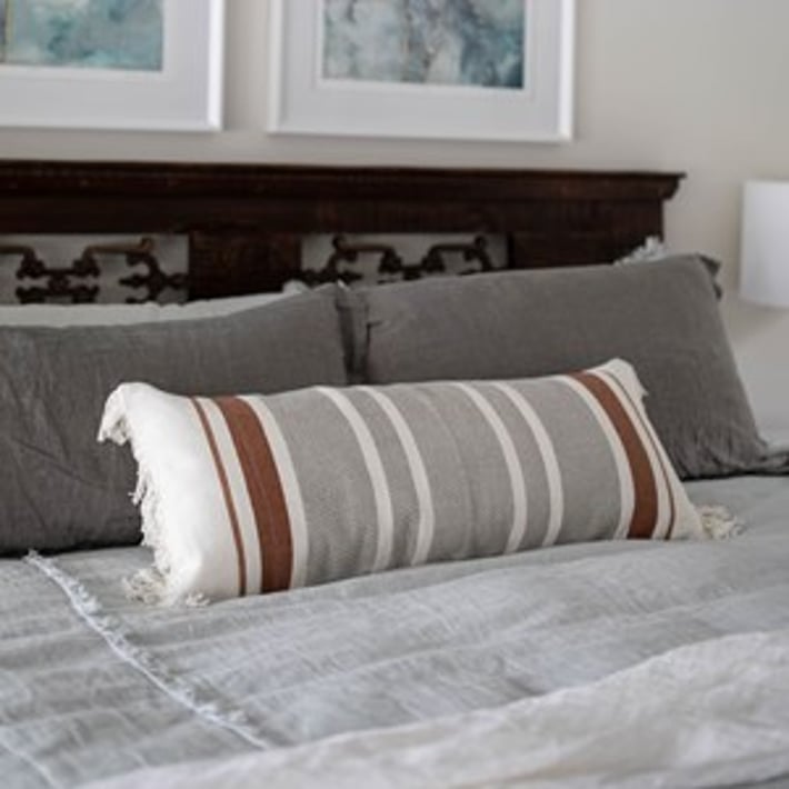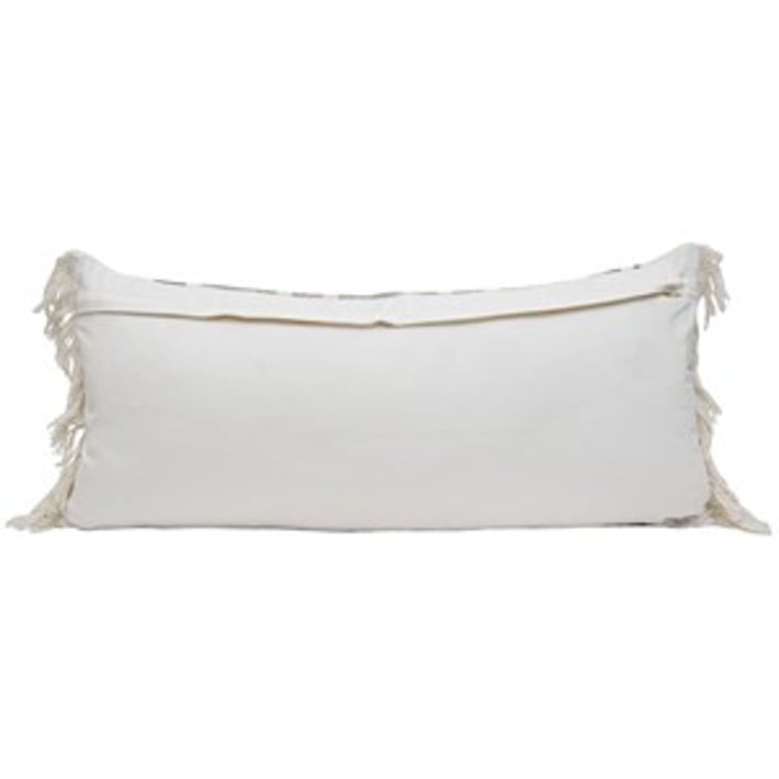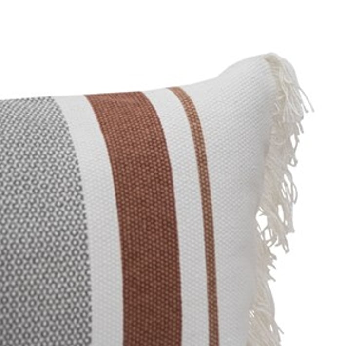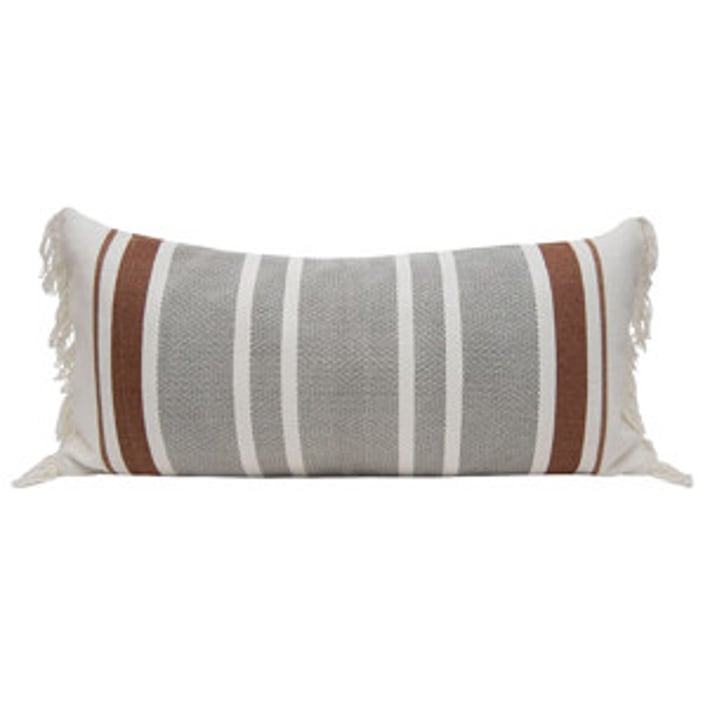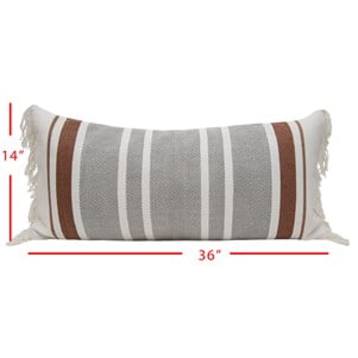 Add a touch of bohemian charm to your living space with this hand-woven lumbar pillow. The flat woven stripes in gray and rust tones create a timeless and simple design that will complement any decor style. The white fringe adds a unique and playful touch to this long throw pillow. Made with a cotton base and polyester fill, this pillow is not only stylish but also comfortable. Perfect for adding a pop of color and texture to your sofa or bed, this lumbar pillow is a must-have for any home looking to achieve an earthy, boho vibe.