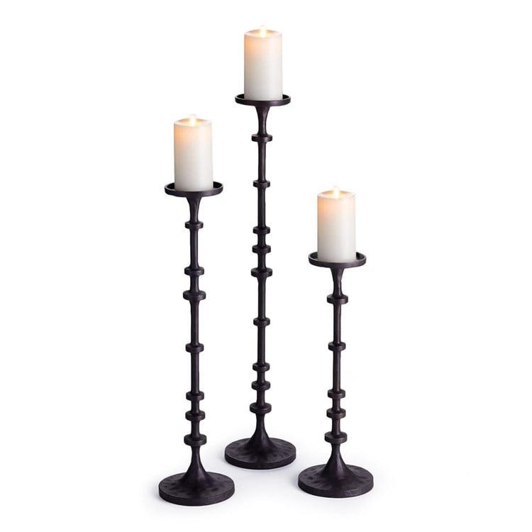 Description: These substantial, over-scaled candleholders are great for mantle or front entry. A nod to the old way of counting, the notches along the base add a modern touch.