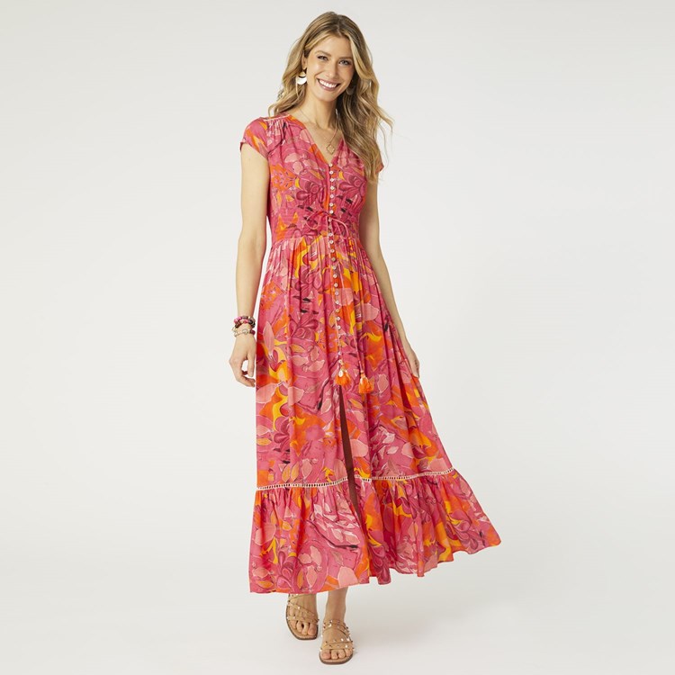 Description: Get ready to turn heads with our Aliya Button Front Maxi Dress! Bursting with color and featuring a flattering v-neckline and cap sleeves, this dress combines style and comfort effortlessly. The functional mother of pearl buttons down the front and smocking detail around the bottom add a touch of elegance. Perfect for any occasion, this dress is a must-have addition to your wardrobe!