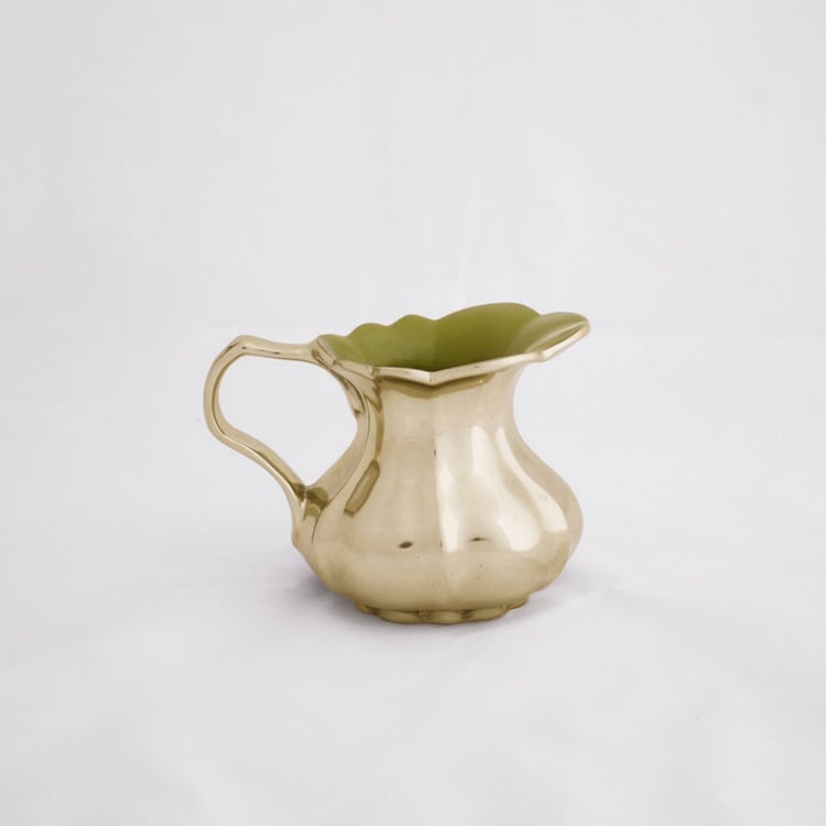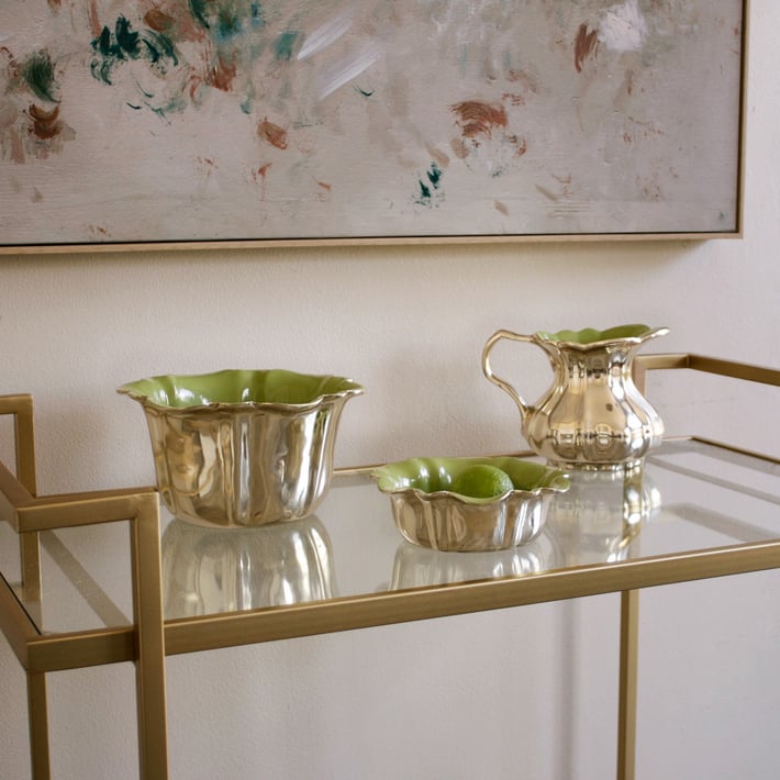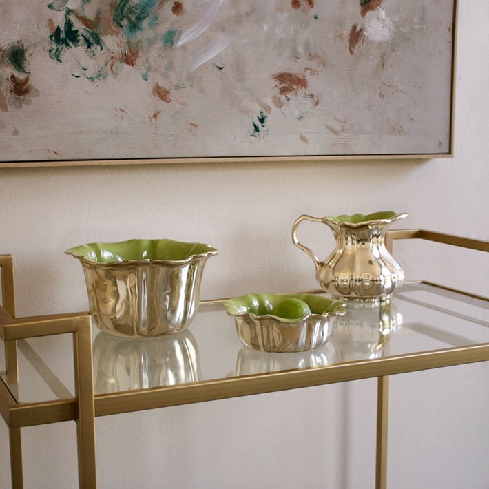 A carnival of color! Beatriz Ball, the award-winning designer, is known for her unique multi-hued metallic pieces that are so sturdy they can even go in commercial dishwashers. Now, she's taking the concept to new levels of beauty with the vibrant CARNAVAL Collection. The CARNAVAL Latur Small Pitcher (Gold and Green) is a charming gold-colored pitcher with a lovely enameled green interior. Add the CARNAVAL ice bucket and wine coaster for a stylish and trendy bar! Beatriz Ball is all about bringing joy and fun to your home with unique and colorful pieces. Dishwasher safe.