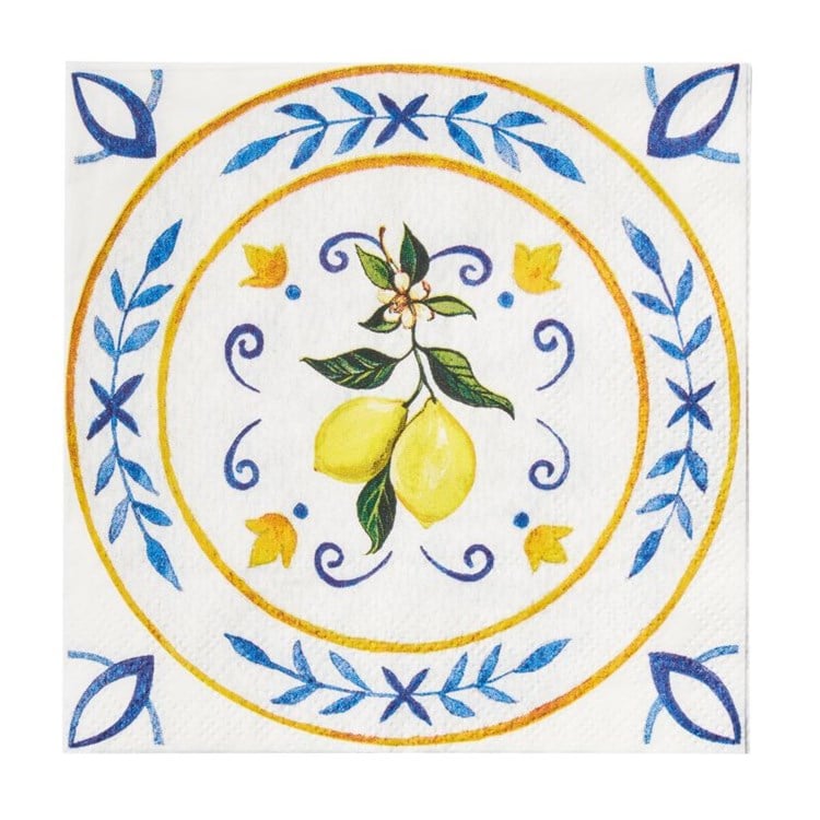Description: These elegant cocktail napkins are the perfect addition to any brunch or holiday gathering, adding a touch of sophistication to your table setting. Impress your guests with these beautiful pieces that pair perfectly with our matching paper tableware collection, Bella plastic cutlery, paper baking cups, and party picks. Great for use as a beverage or cocktail napkin, each pack contains 20 napkins made of 3-ply paper. The white napkins feature a charming lemon and blue pattern, adding a pop of color to your event. Each napkin measures 5" x 5" when folded, making them the ideal size for any occasion.
