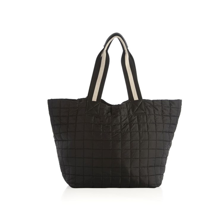 Description: nylon; gold hardware; double handles; detachable, adjustable cross-body strap; top zip closure; 1 outer trolley sleeve, 2 outer zip pockets, 1 inner zip pocket, 2 inner slip pockets