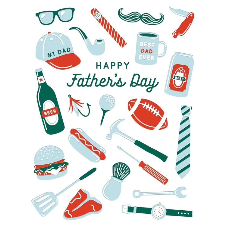 Description: This beautifully crafted Letterpress Father's Day greeting card is the perfect way to celebrate the most important man in your life. The colorful icons and playful details add a touch of whimsy, while the clear foil and embossing give it a luxurious feel. With plenty of space inside for a heartfelt message, you can let your father know just how much he means to you. Show your appreciation and love with this charming card that is sure to make his day extra special.