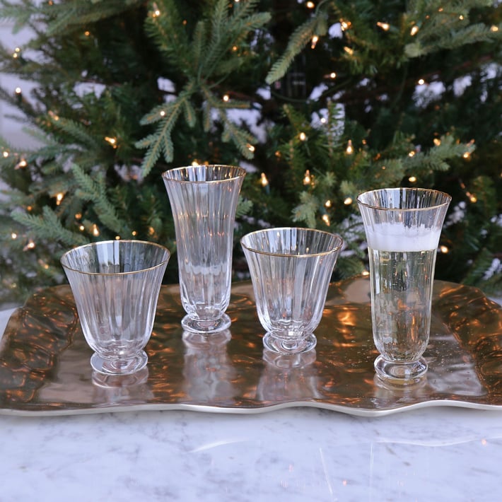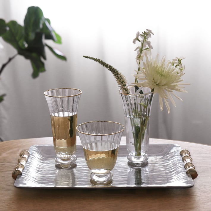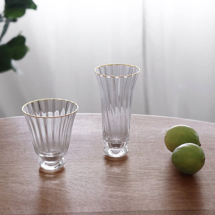 Description: Who can it be now? Tall and impressive, our Audrey Stemless Flute with Gold Rim is a glass with a split personality. The brilliantly clear Audrey Stemless Flute from our GLASS Collection is distinguished by its light-catching rippling optics, flaring floral shape and luxurious gold rim. A great glass for serving sparkling wine, it doubles as a delightful bud vase. Pair with our GLASS Audrey Stemless All Purpose Glass with Gold Rim to increase sales.