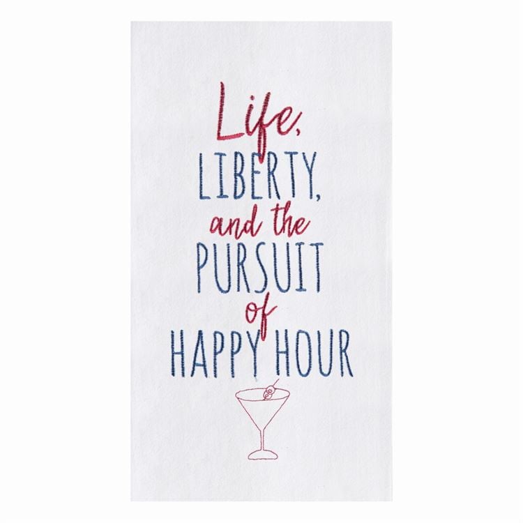 Celebrate the pursuit of happiness with this charming flour sack towel, featuring a playful design that captures the essence of happy hour and American pride. Made of soft and absorbent cotton, this towel is not only a practical addition to any kitchen, but also a fun and festive decoration for Independence Day. Whether you're drying dishes or getting ready for a backyard BBQ, this towel is sure to bring a smile to your face and add a touch of patriotic flair to your home. Perfect for gifting or keeping for yourself, this towel is a must-have for anyone who loves to celebrate life, liberty, and the pursuit of happiness.