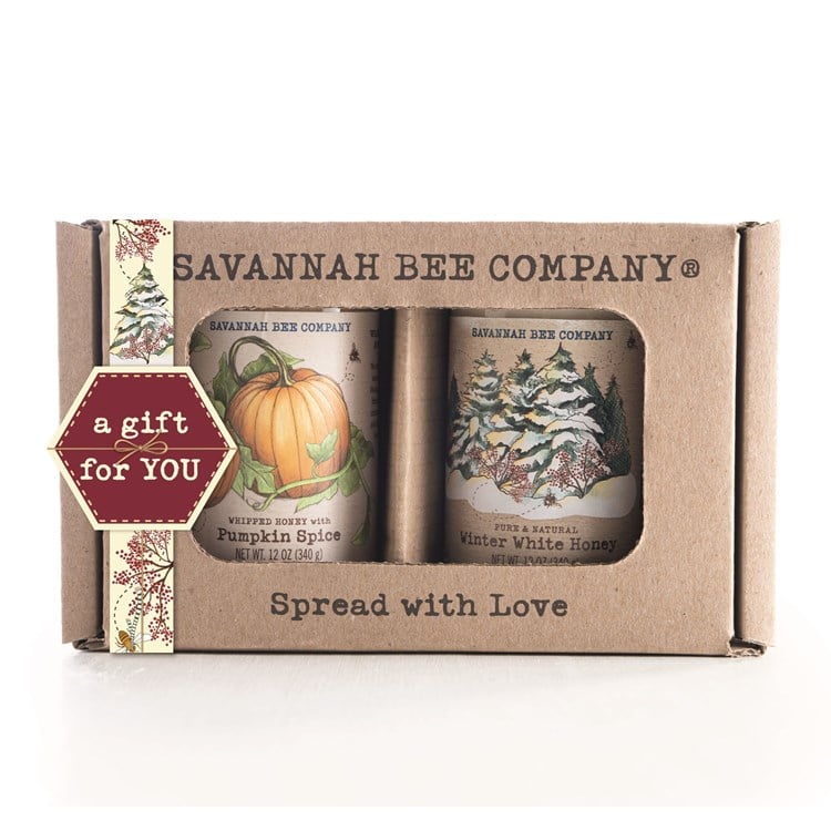 Description: NEW HOLIDAY DUO gift set with Pumpkin Spice & Winter White Honey. Savannah Bee spins honey to achieve a creamy, crystallized state, making it the most delicious spreadable honey. SPREAD with LOVE!