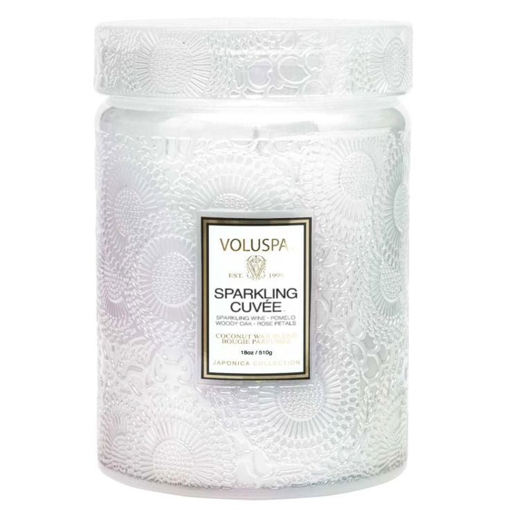 Pop a bottle of Voluspas finest blend, its time to celebrate! A mix of beautiful aromatic complexity, Sparkling Cuve opens with vivacious fruit tones of Sparkling Wine, Pomelo and Red Currant. The effervescence of Sparkling Wine is the heart of the celebration, with bubbles cascading to the surface, dancing and mingling with juicy Nectarine and Bulgarian Rose Petals. A velvety, smooth finish of Woody Oak serves as the perfect stage for this aromatic affair. Raise a glass of Sparkling Cuve, your olfactory aperitif for every unforgettable occasion. Voluspa's unique coconut wax blend is hand-poured into a 18 oz. embossed glass vessel and is topped with a glass lid, adorned with Japonica detailing that keeps the candle dust-free when not in use. The single wick allows you to enjoy fragrance throw for 100 hours. Our candles are hand-poured in the United States and feature our proprietary, clean-burning coconut wax blend and 100% natural wicks. Our products are free of phthalates, pesticides, parabens and sulfates and are never tested on animals. Up-cycle this best seller into a keepsake after the last burn.